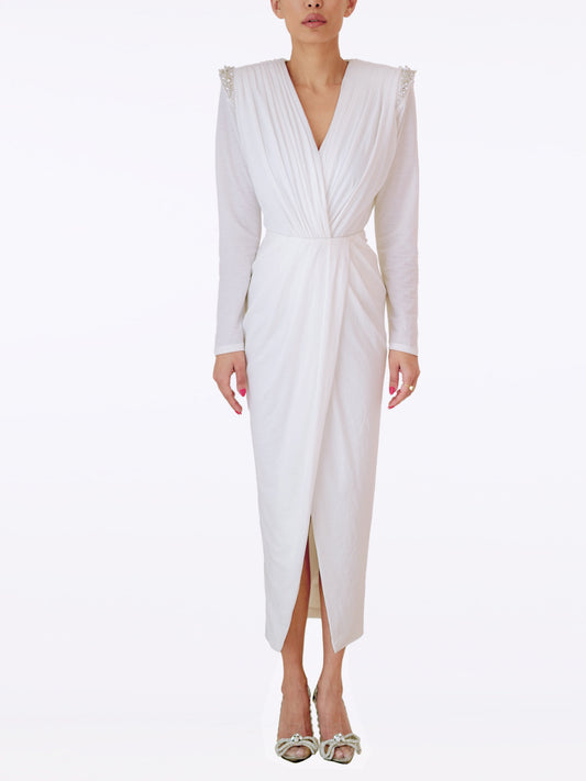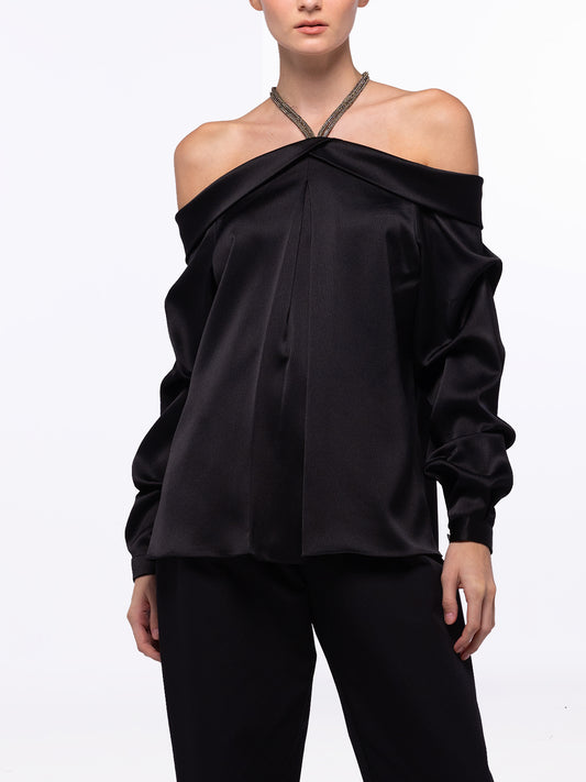 Exude elegance with our crystallized neckline draped sleeve Alice top in a beautiful hammered satin. Style...
