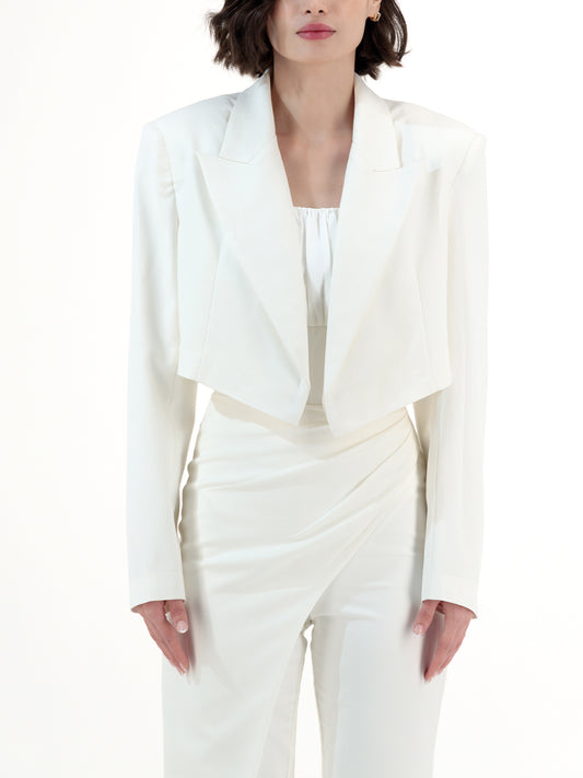 Tux inspired oversized jacket cropped at waist that makes any look super elevated. Pair this...