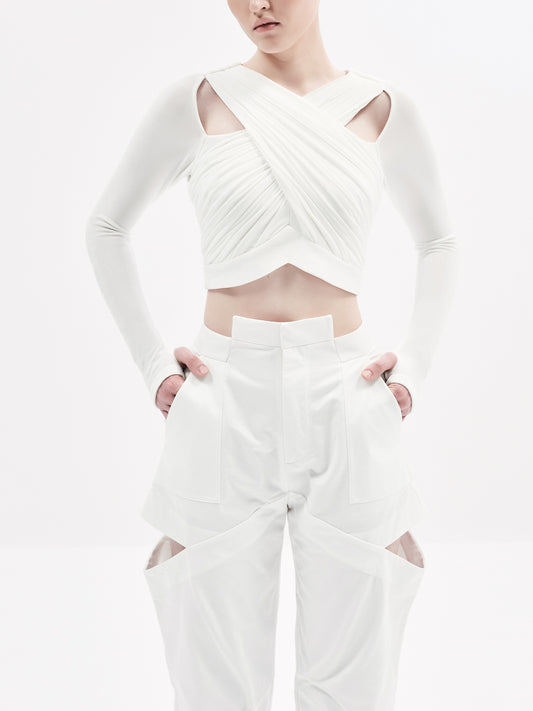 Exuding understated elegance, this peekaboo criss-cross draped crop is tailored to sit perfectly at your...