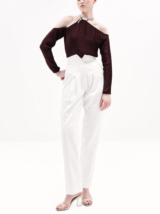 Effortlessly refined, this crop features a striking snake-neck detail and chic cold-shoulder cut, crafted in...