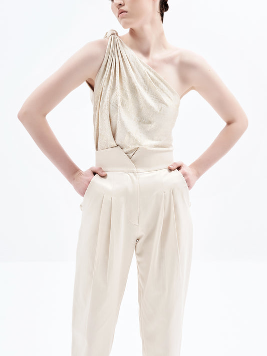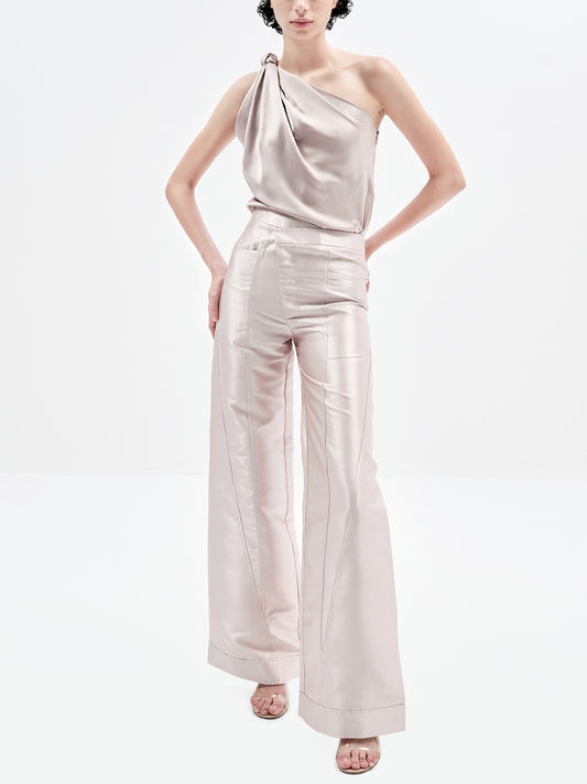 Refined and contemporary, these cummerbund-inspired pants feature front tuck pleats and a high-waisted fit for...