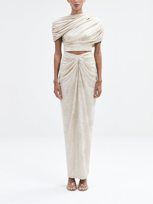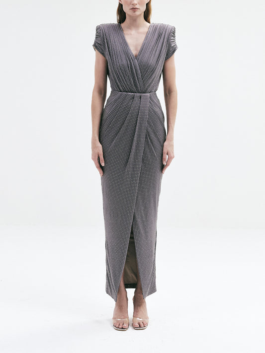 Make a bold statement with our Jemima Draped Maxi, where modern design meets timeless elegance....