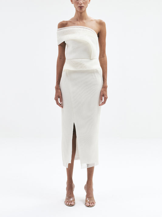 Meticulously sculpted and draped in scuba mesh, this dress creates a stunning silhouette, making it...