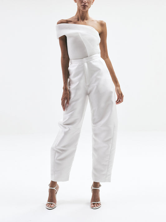 Structured meets sensuality in this stunning gown that has exaggerated padded shoulders to balance the...