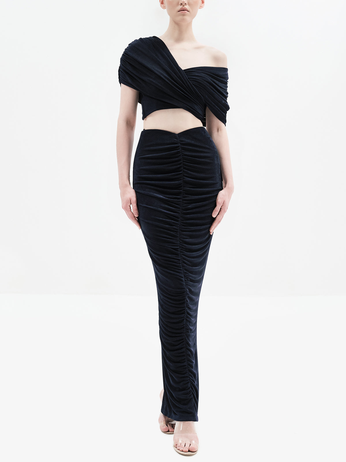 Flatter your silhouette with the Alaia Skirt, ruched at the front and back for a sleek, sculpted fit. This metallic foil statement skirt effortlessly elevates any outfit, making it perfect for day-to-night styling. Pair it with our Victoria Corset, Gemma Bodysuit, Stella Crops or Dori Bodysuit to create multiple chic, versatile looks that showcase your style.