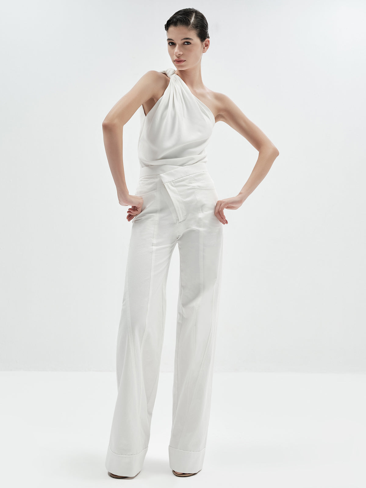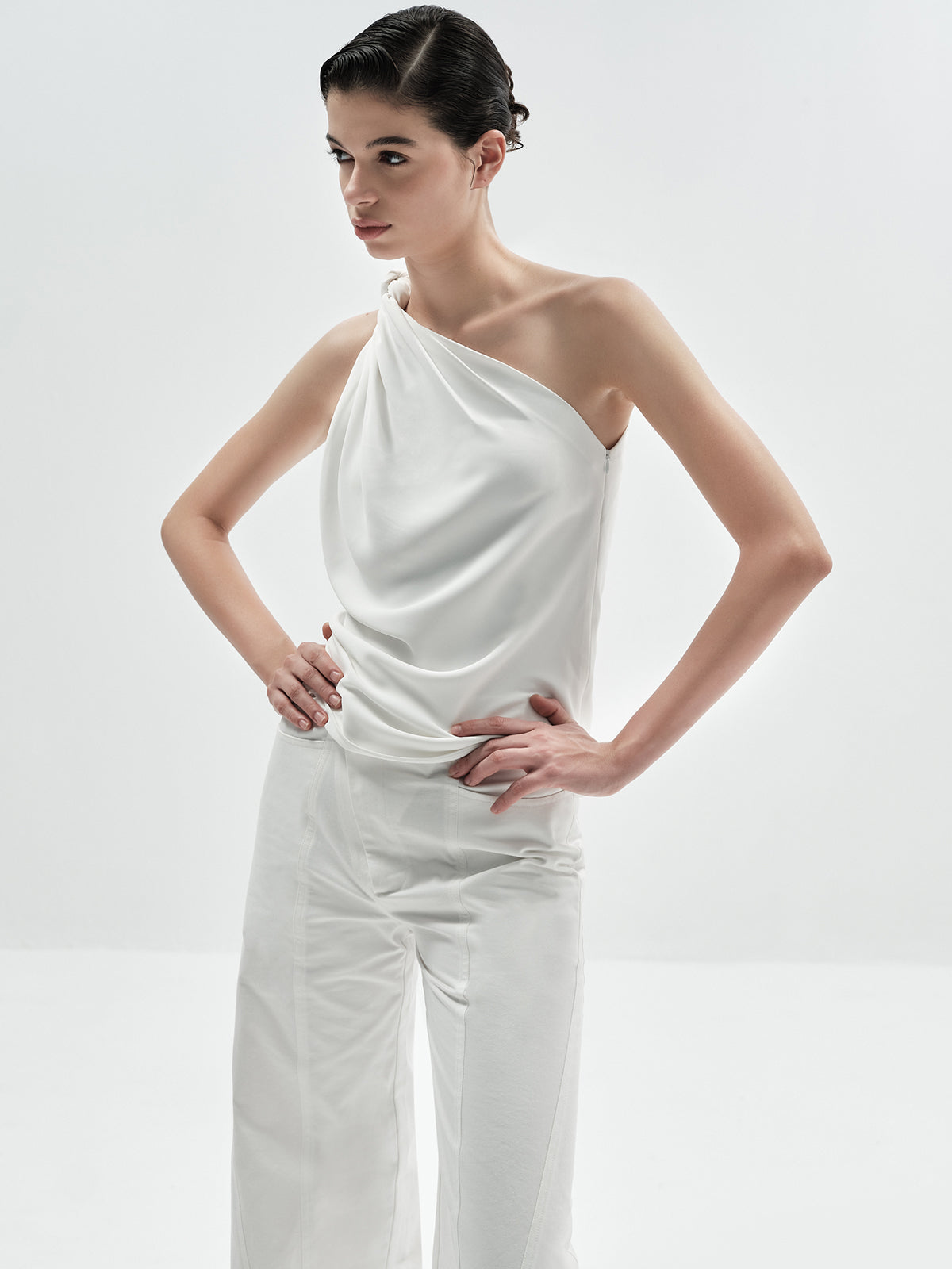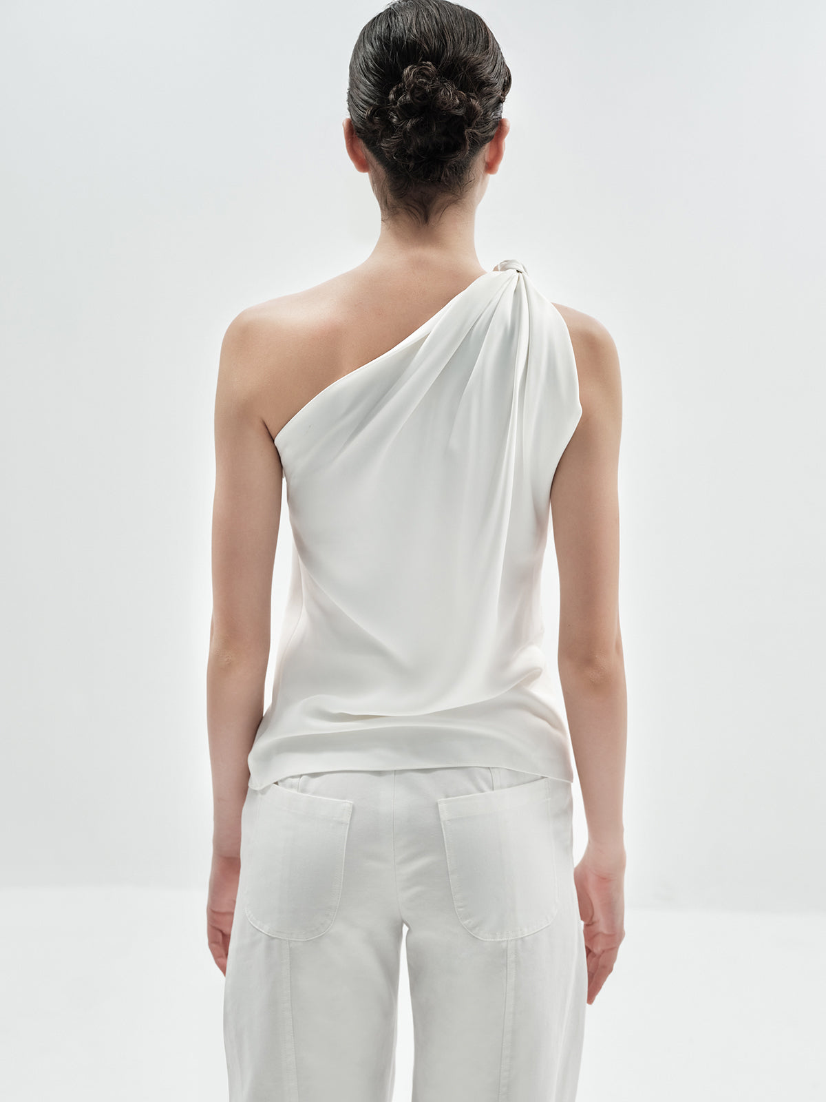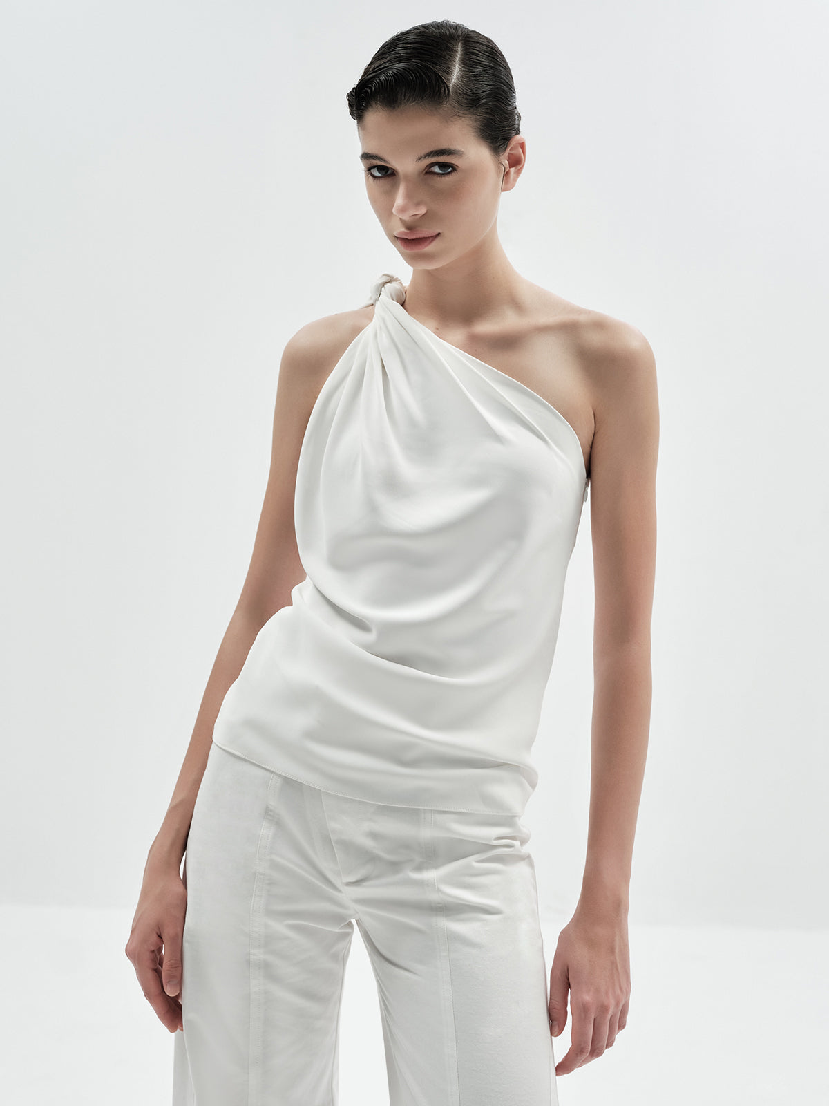 Refined and effortlessly stylish, this fluid top features a one-sided knot that adds a touch of sculpted elegance. Pair it with any of our pants, skirts, or shorts for an understated yet elevated look.