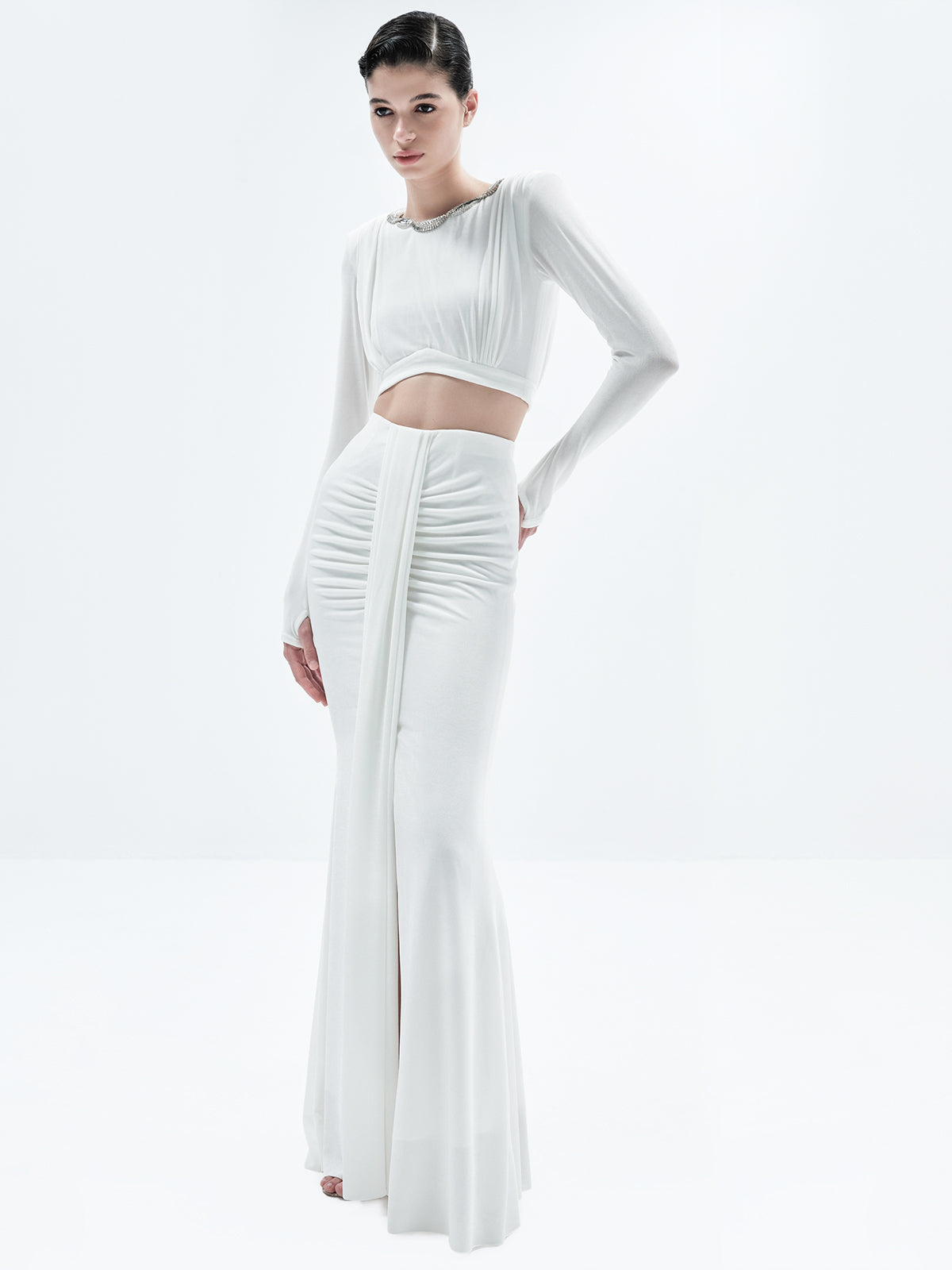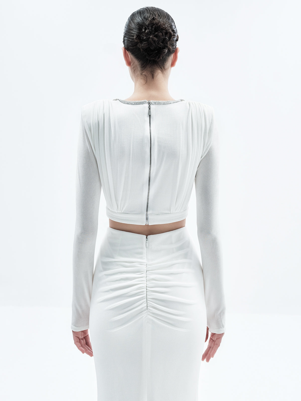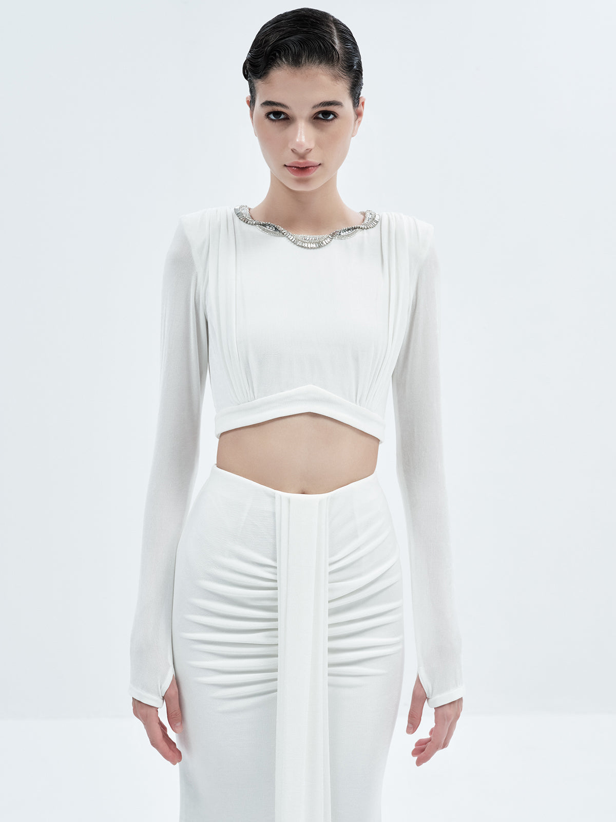 Designed to make a statement, the Joanna Crop features an embellished neckline, pleated detailing at the front and back, thumbhole accents, and a sleek metal zipper at the back; making it a piece designed to turn heads.
