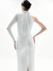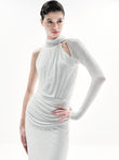 Shine in our Crystal Mesh High-Neck Bodysuit, featuring a dramatic one-sleeve design with chic thumbhole detailing. Crafted from a luxurious crystal mesh fabric and draped meticulously at front as well as back, to deliver a flattering yet forgiving fit. This bodysuit ensures comfort without compromising on style.