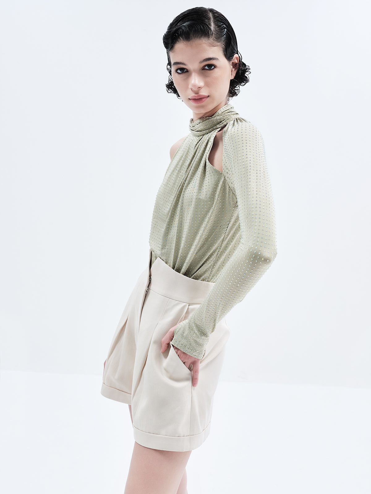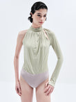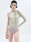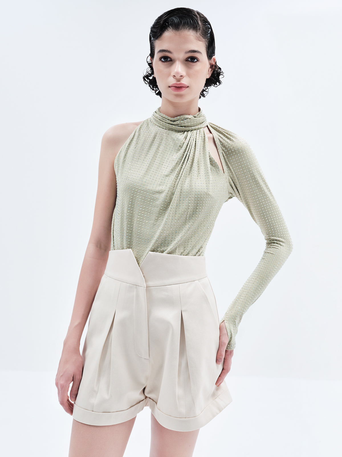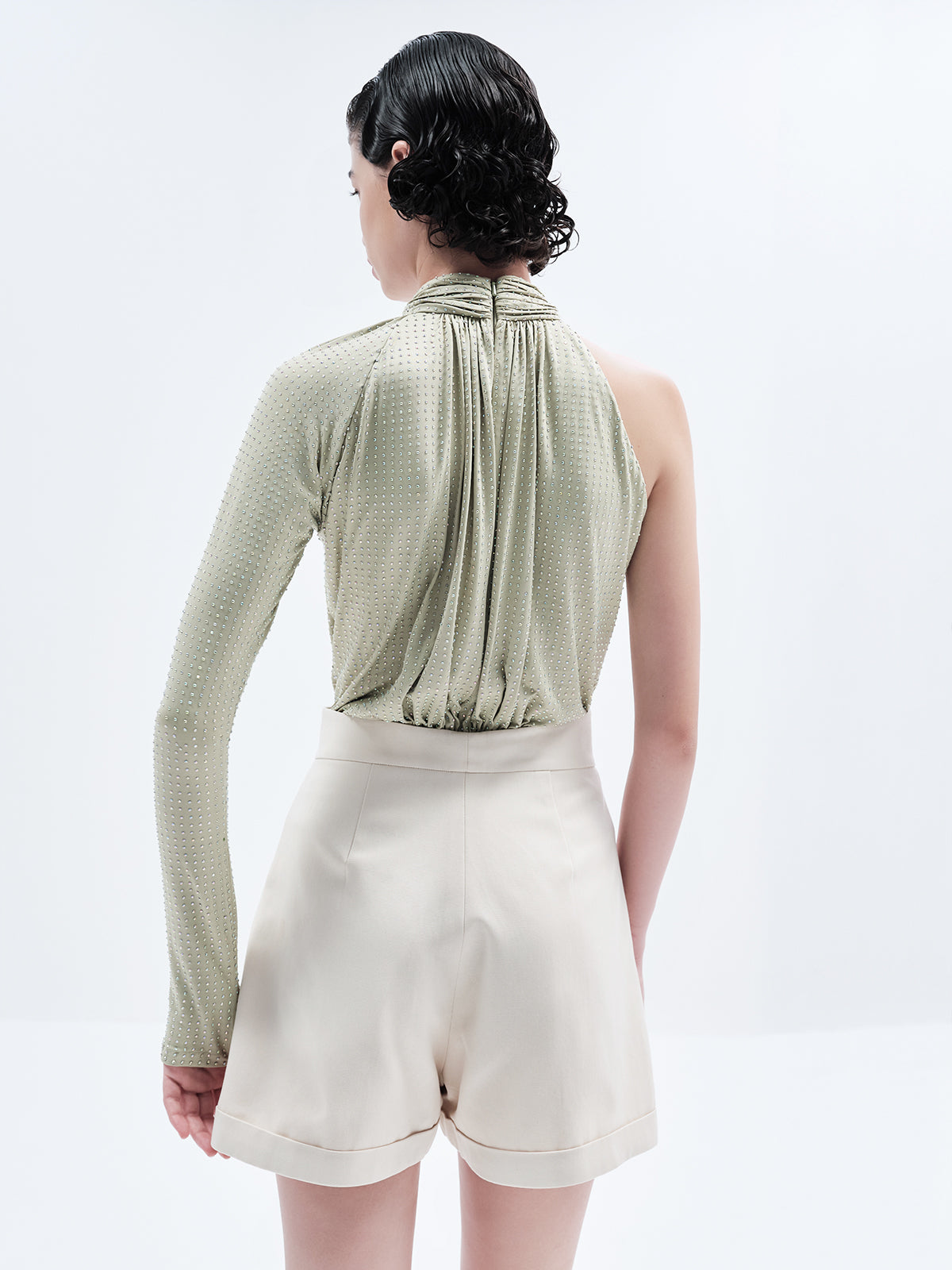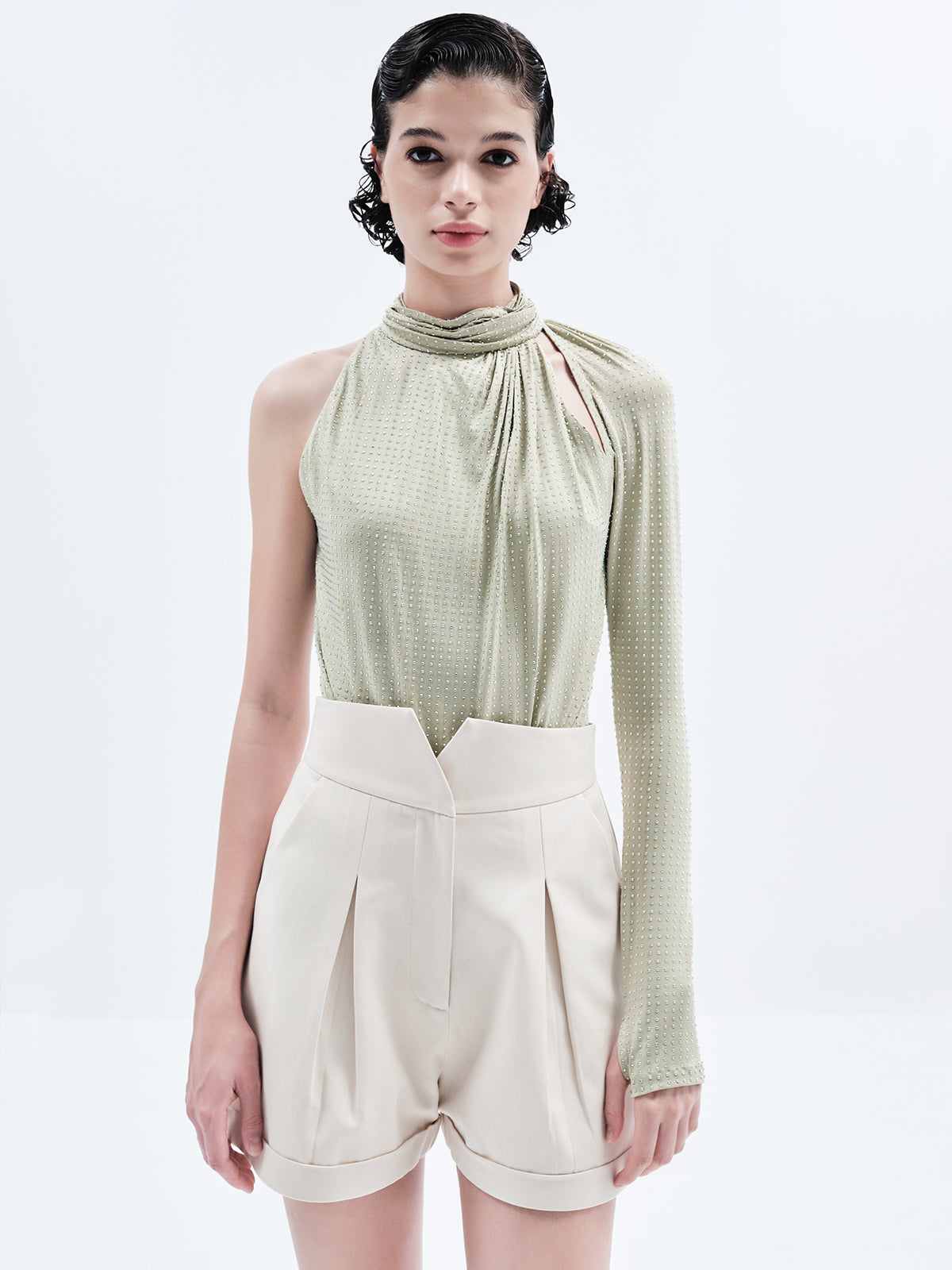 Sculpted High-Neck One-Sleeve Rhinestone Bodysuit