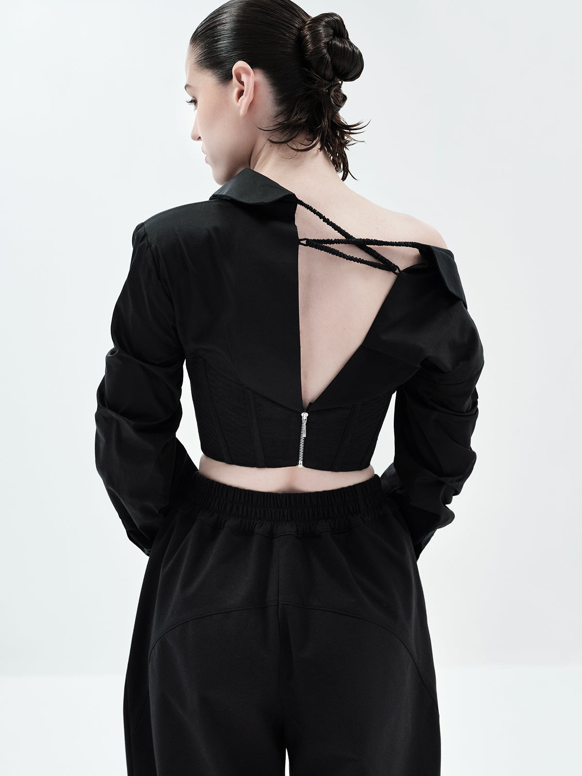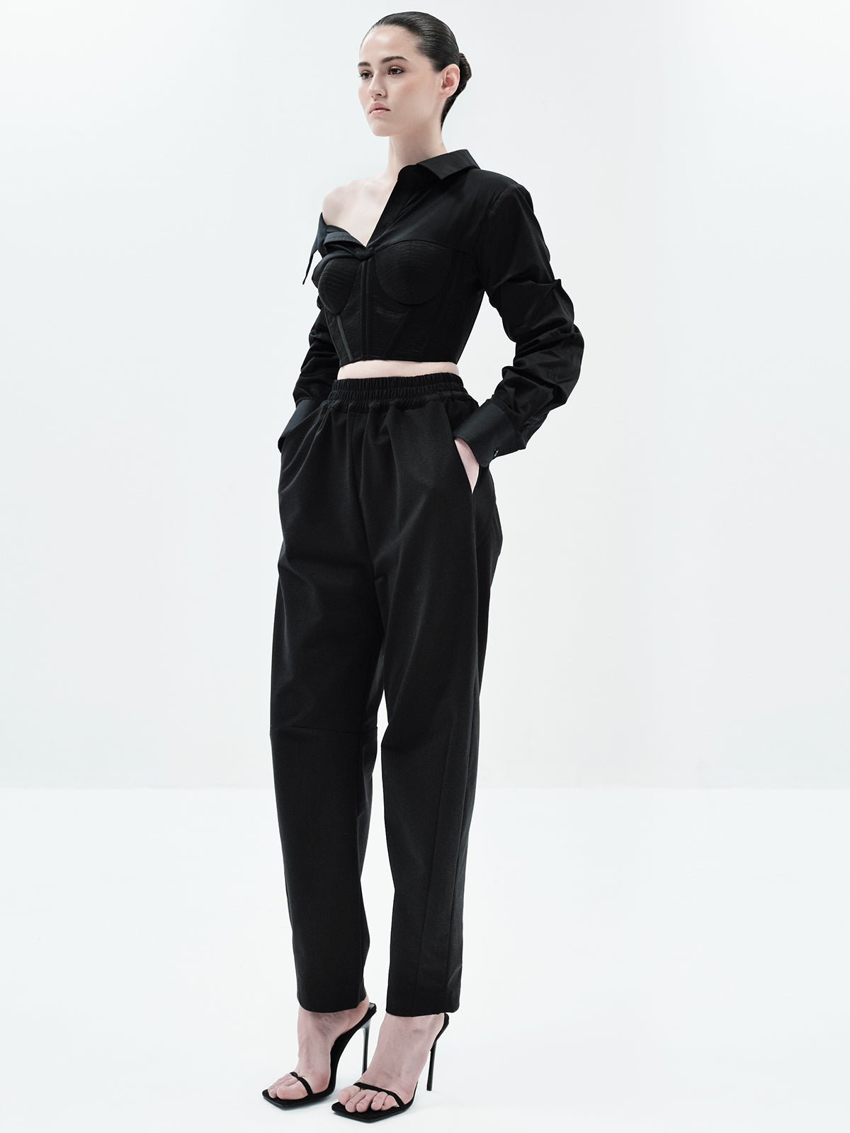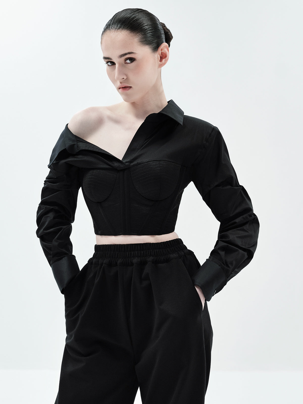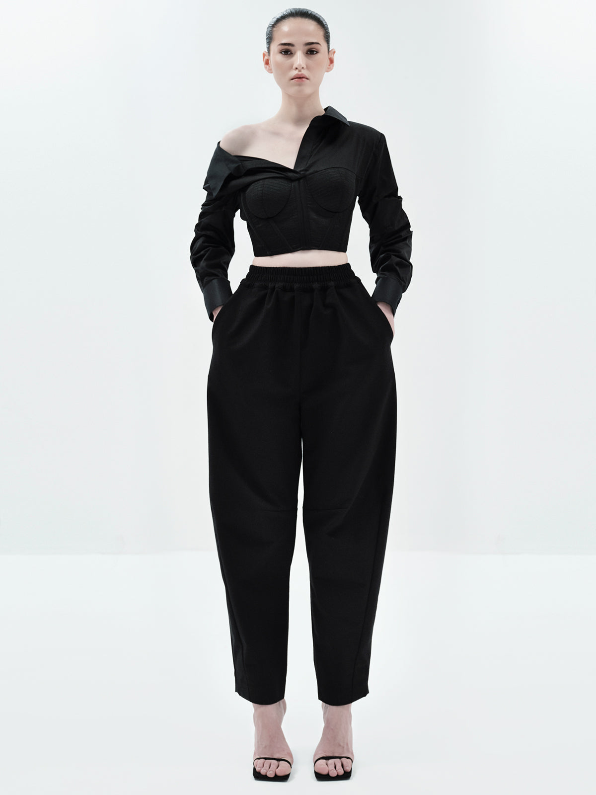 Make a statement in our Lana Crop Shirt, featuring a one-shoulder design and ruched sleeve detailing for a flattering, sculpted silhouette. The structured corset detailing elevates the look, while the pleated bustier adds refined dimension. Style it with our classic Eddie Pants, Edwina Pants for a jumpsuit-inspired vibe, or laticia shorts for a chic romper effect
