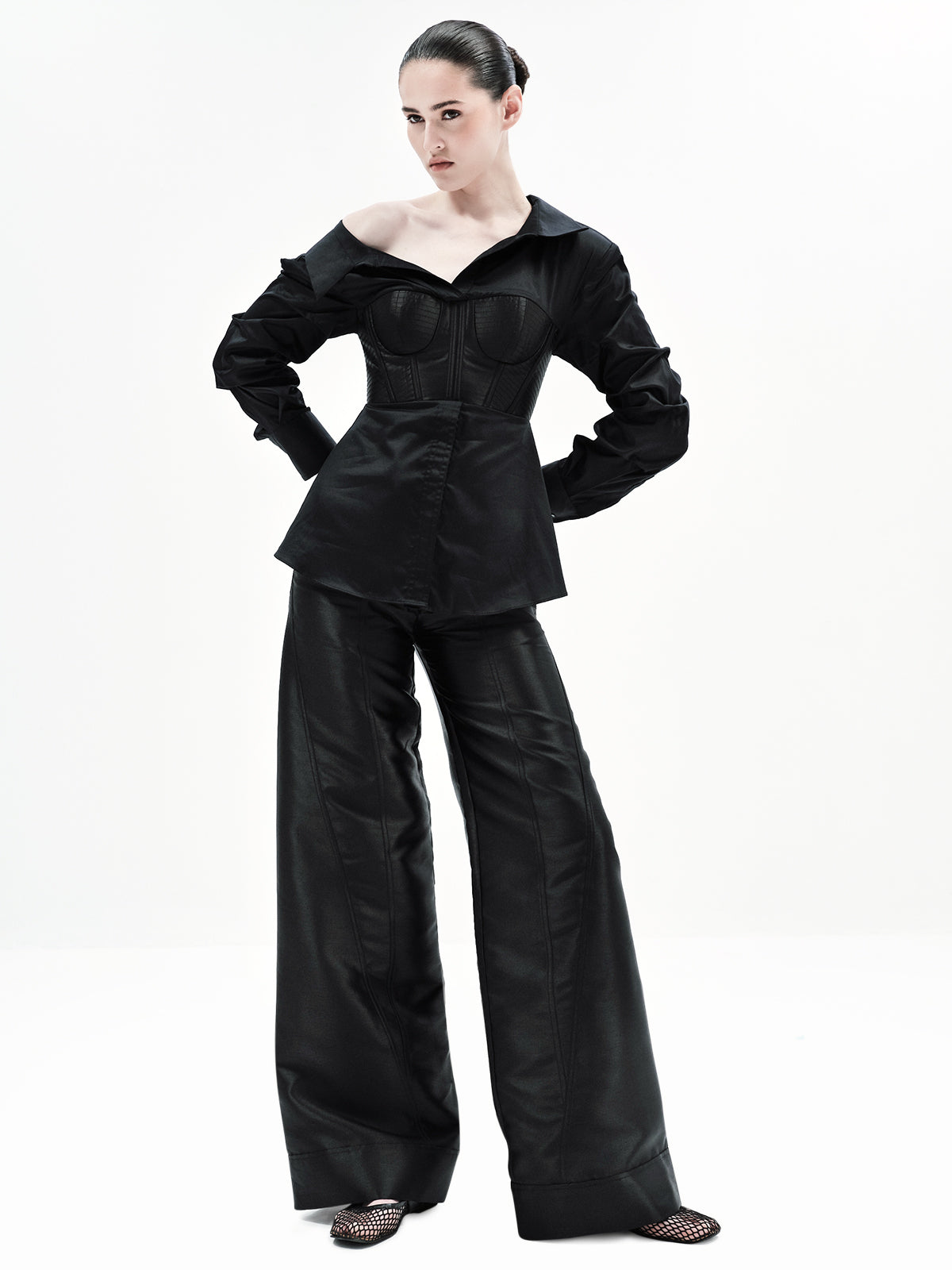 Make a statement in our Lana Corset Shirt, featuring a one-shoulder design and ruched sleeve detailing for a flattering, sculpted silhouette. The structured corset detailing elevates the look, while the pleated bustier adds refined dimension. Style it with our classic Maria Pants, Pepe pants or Edwina Pants for a jumpsuit-inspired vibe
