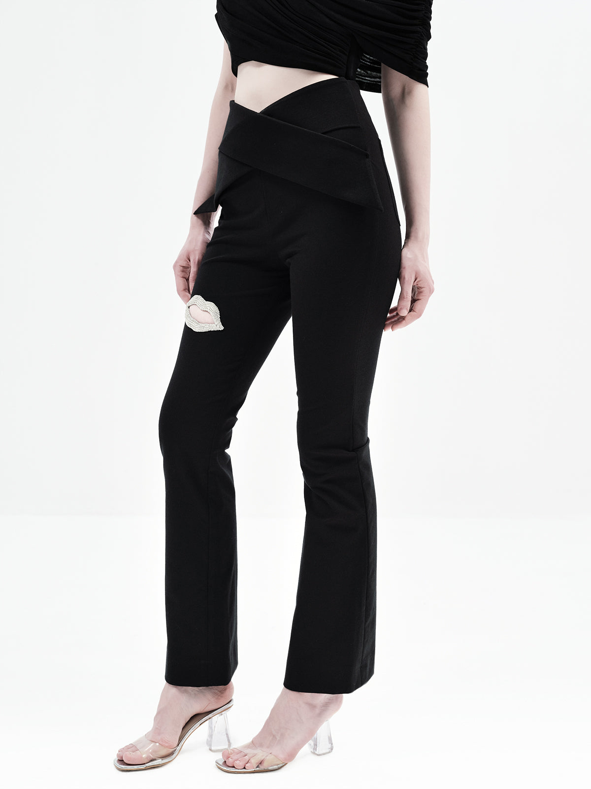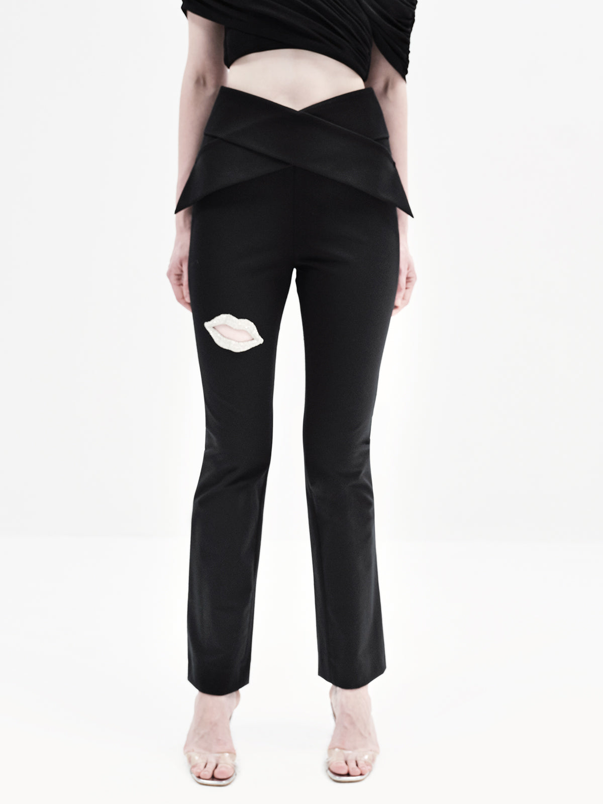 Unleash your bold, playful side with our Lia Lip Pants. These statement trousers feature an embellished lip motif on one side, adding a touch of intrigue and luxe detail. Designed to turn heads, they pair effortlessly with minimalist tops or elevated bodysuits for a daring, fashion-forward look.