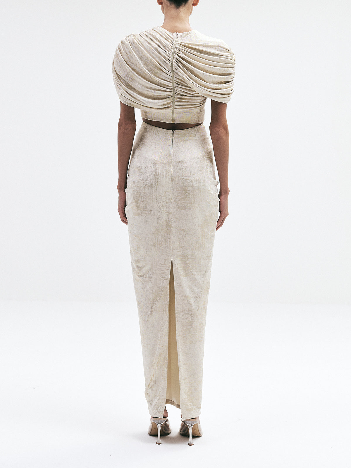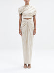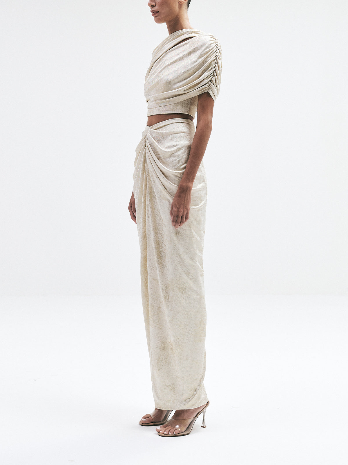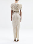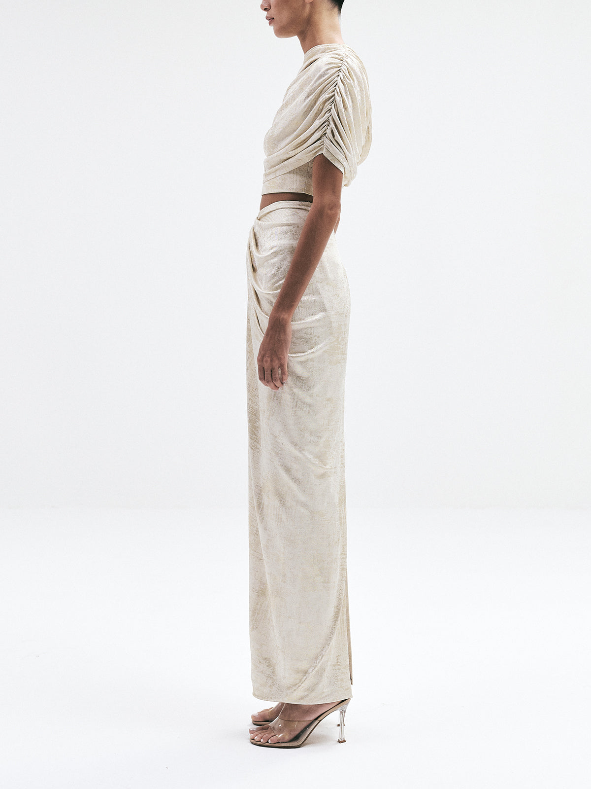 This versatile piece features expertly crafted ruching along the center front, creating a flattering silhouette that accentuates your curves. The ankle-length design offers a timeless appeal, while the subtle detailing adds texture and interest. Make the perfect set by pairing it with our Embellished neck detail Melanie crop top!