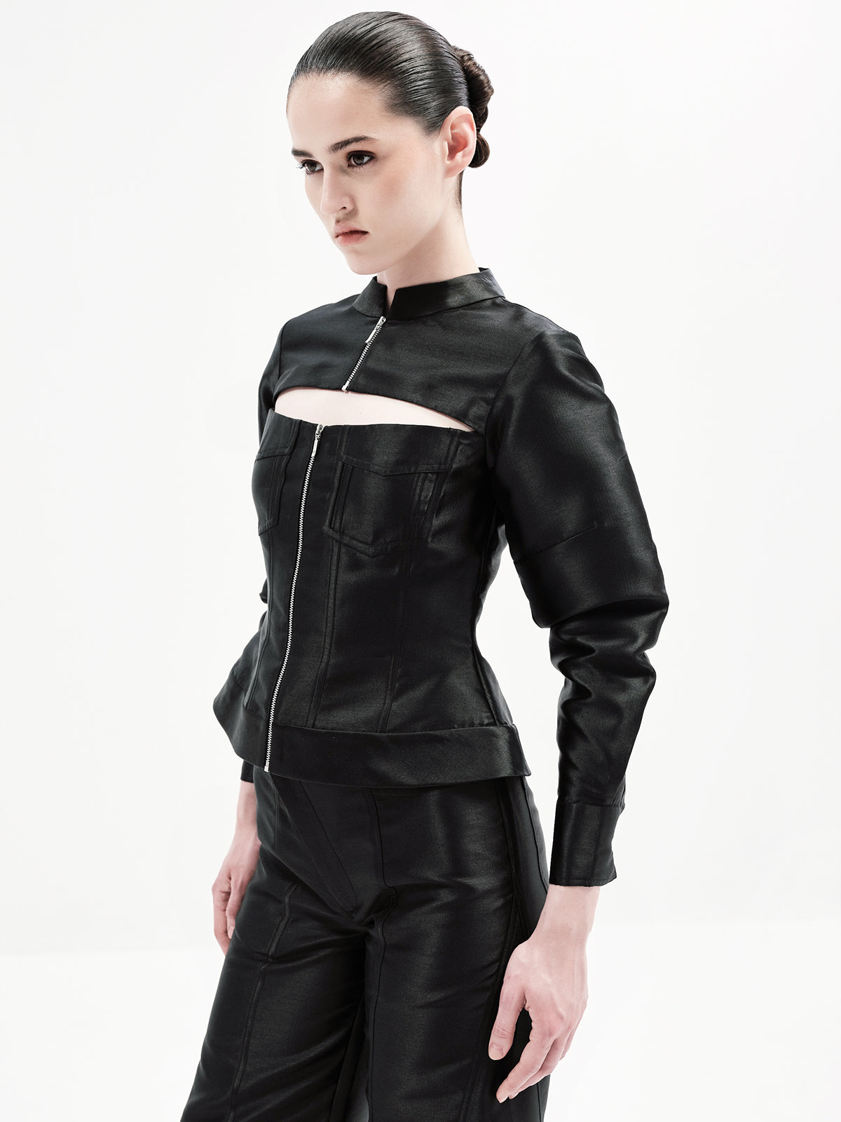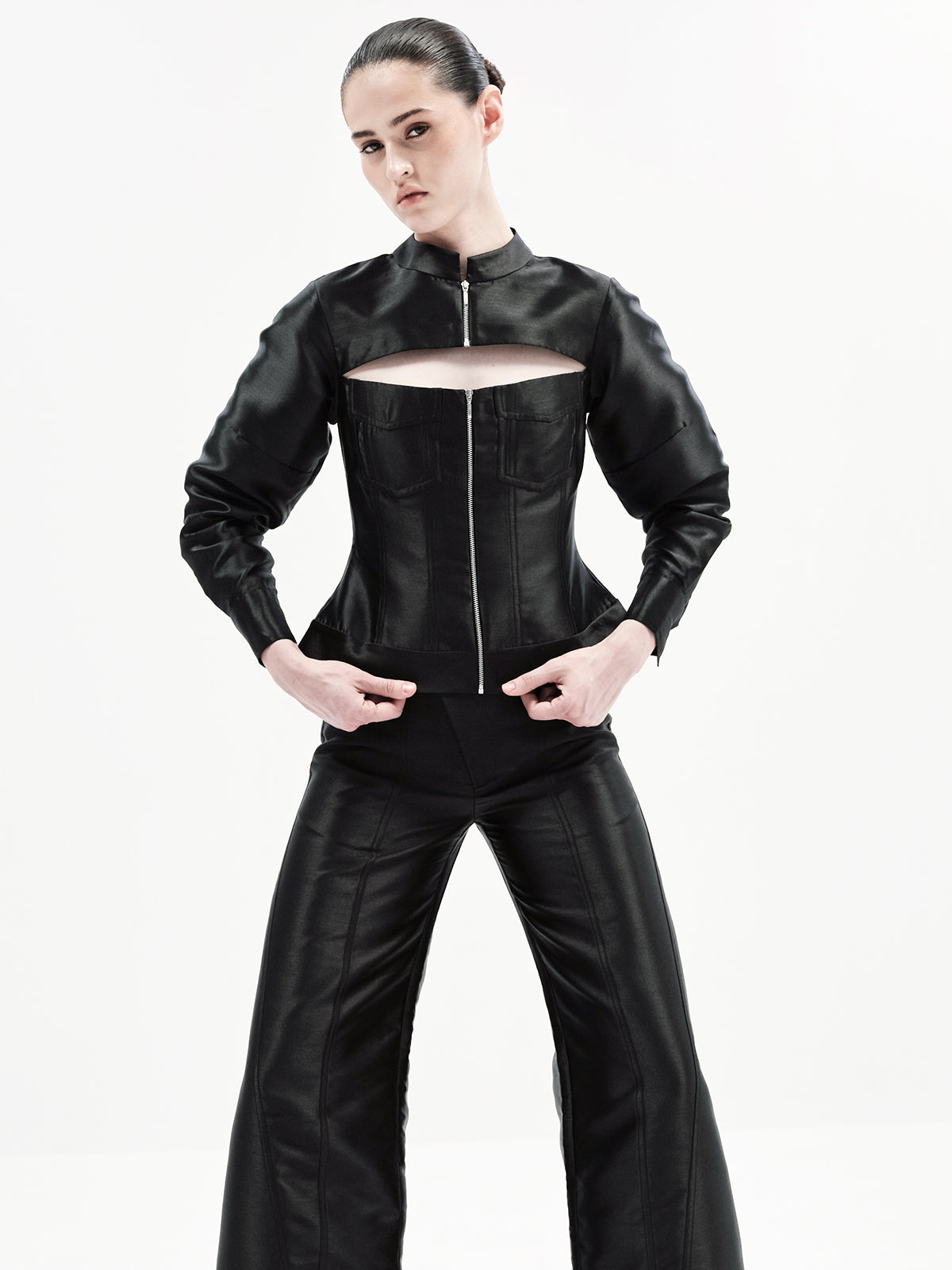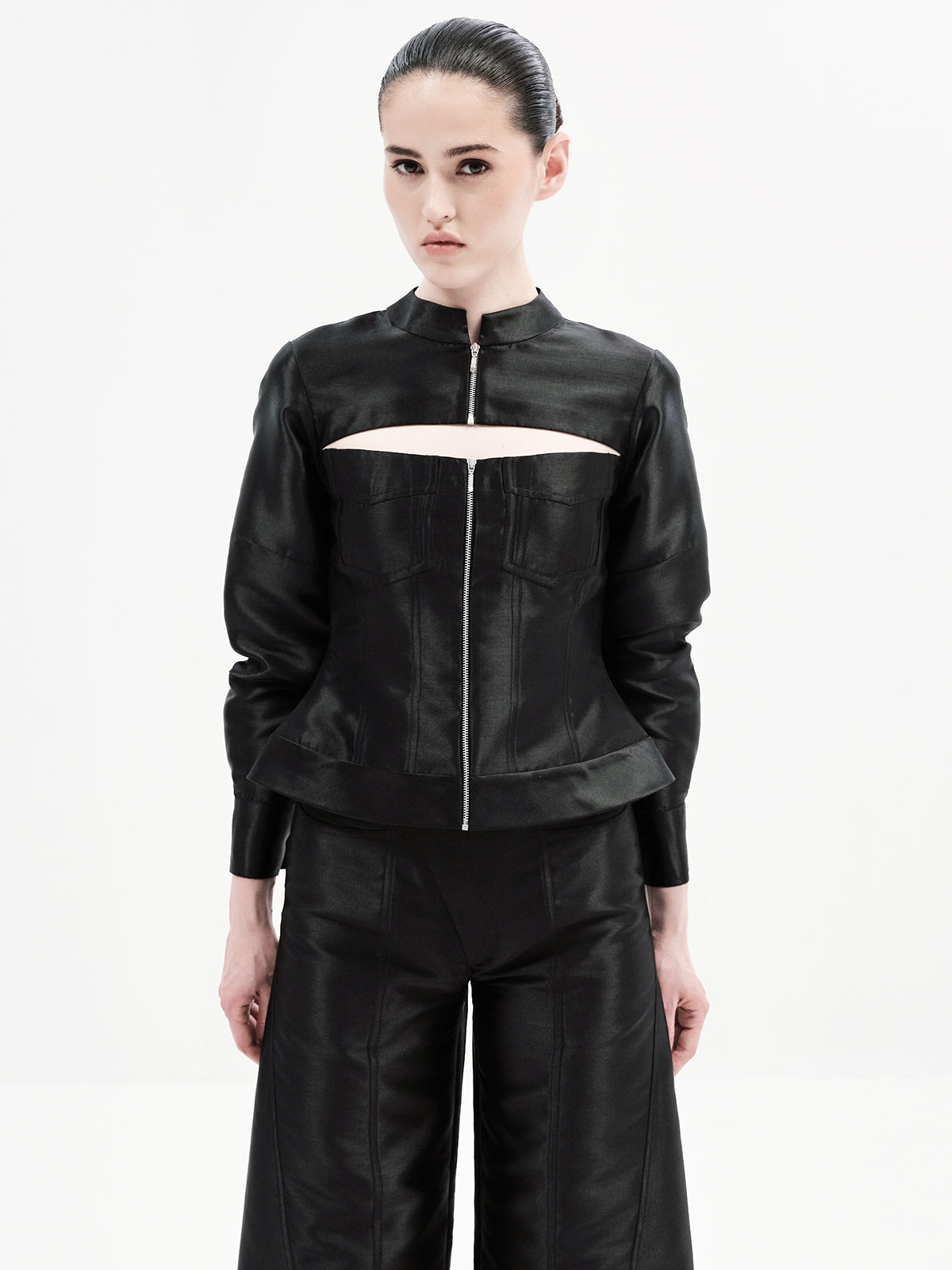 This edgy bomber-inspired A-line top features a peekaboo neckline, metal zipper accents, and precise seam detailing for a statement finish. Pair it effortlessly with any of our high-waisted bottoms to create multiple elevated looks—our top picks are the Maria Pants or Eddie Pants for a chic co-ord ensemble.