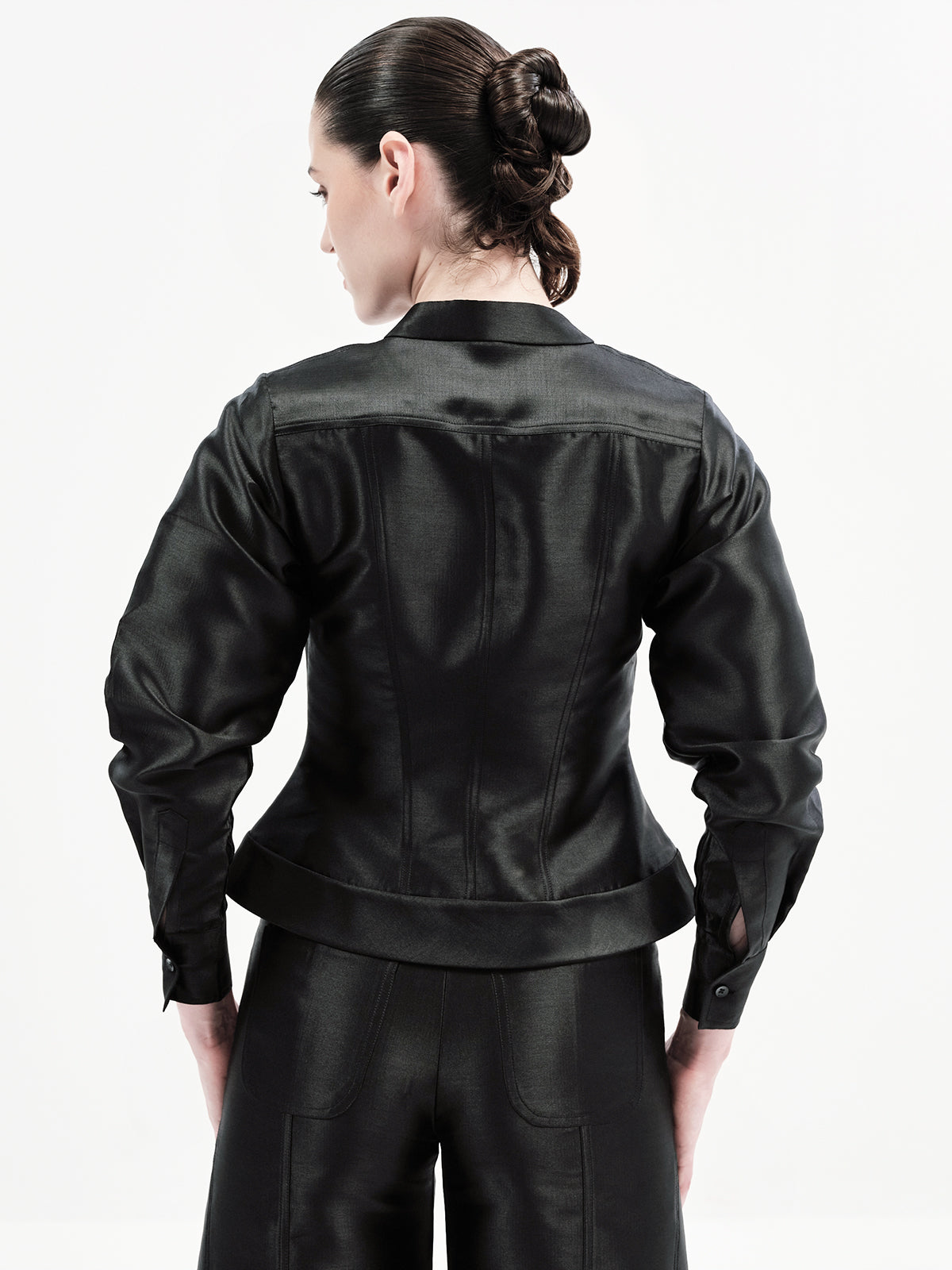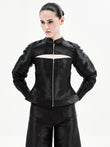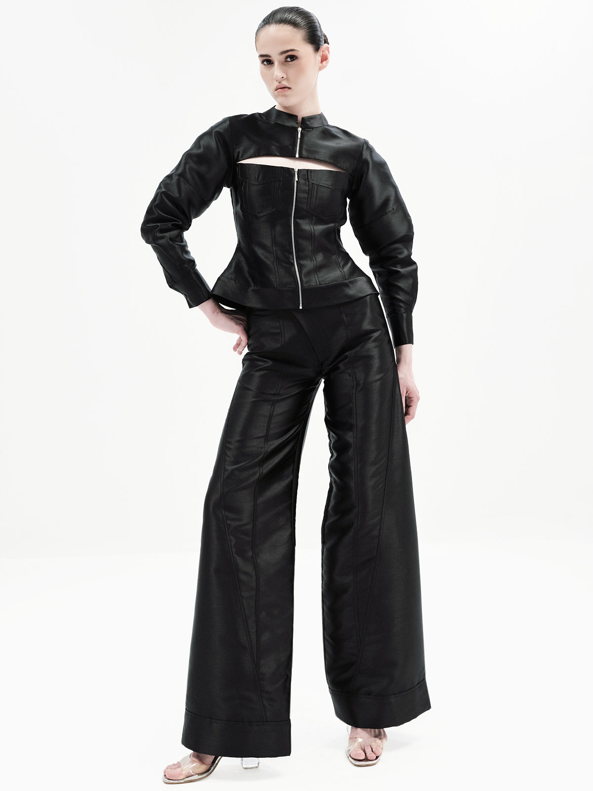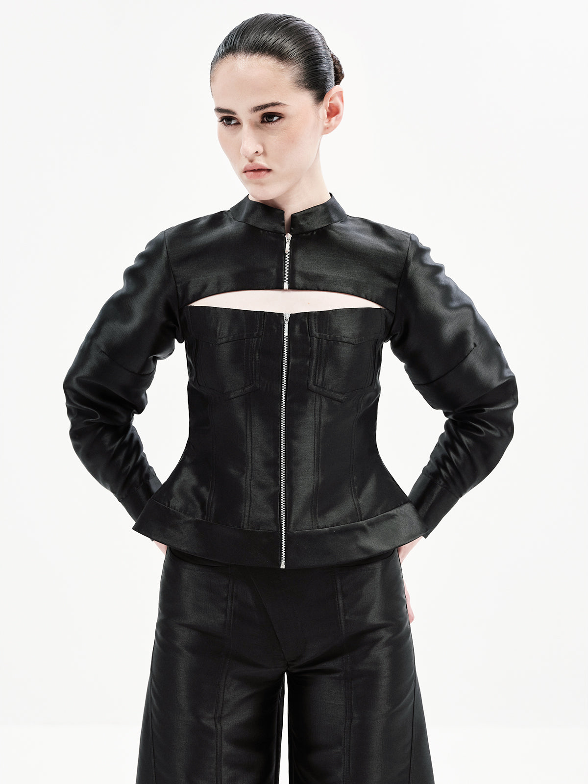 This edgy bomber-inspired A-line top features a peekaboo neckline, metal zipper accents, and precise seam detailing for a statement finish. Pair it effortlessly with any of our high-waisted bottoms to create multiple elevated looks—our top picks are the Maria Pants or Eddie Pants for a chic co-ord ensemble.