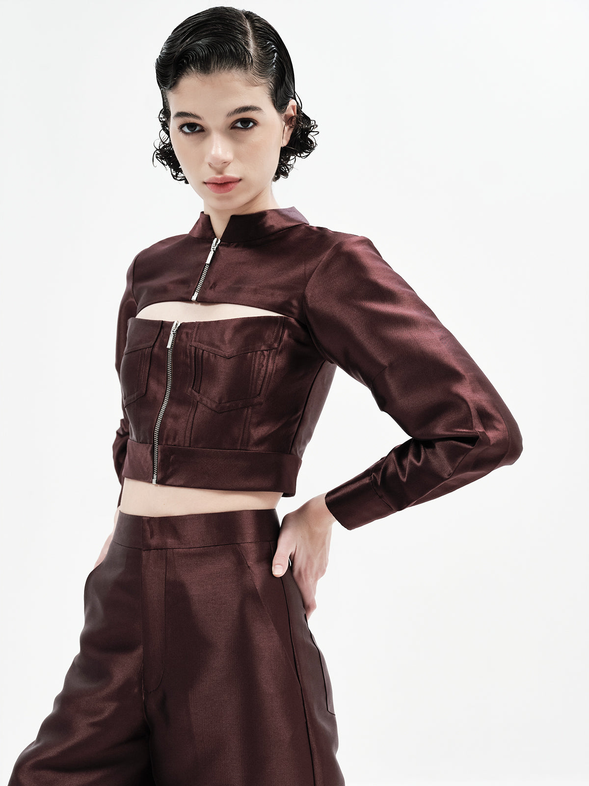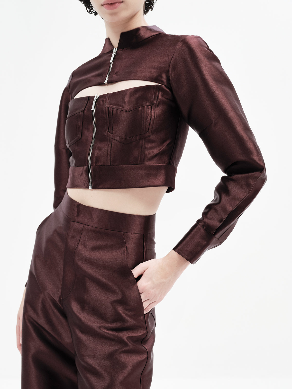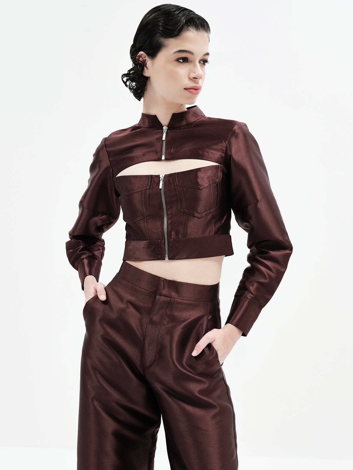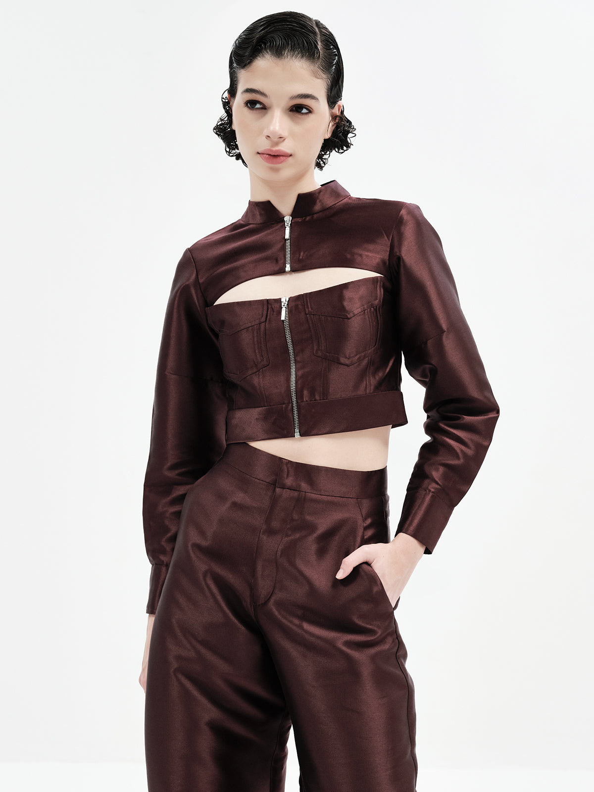This edgy bomber-inspired crop features a peekaboo neckline, metal zipper accents, and precise seam detailing for a statement finish. Pair it effortlessly with any of our high-waisted bottoms to create multiple elevated looks—our top picks are the Maria Pants, Laticia Shorts or Eddie Pants for a chic co-ord ensemble.