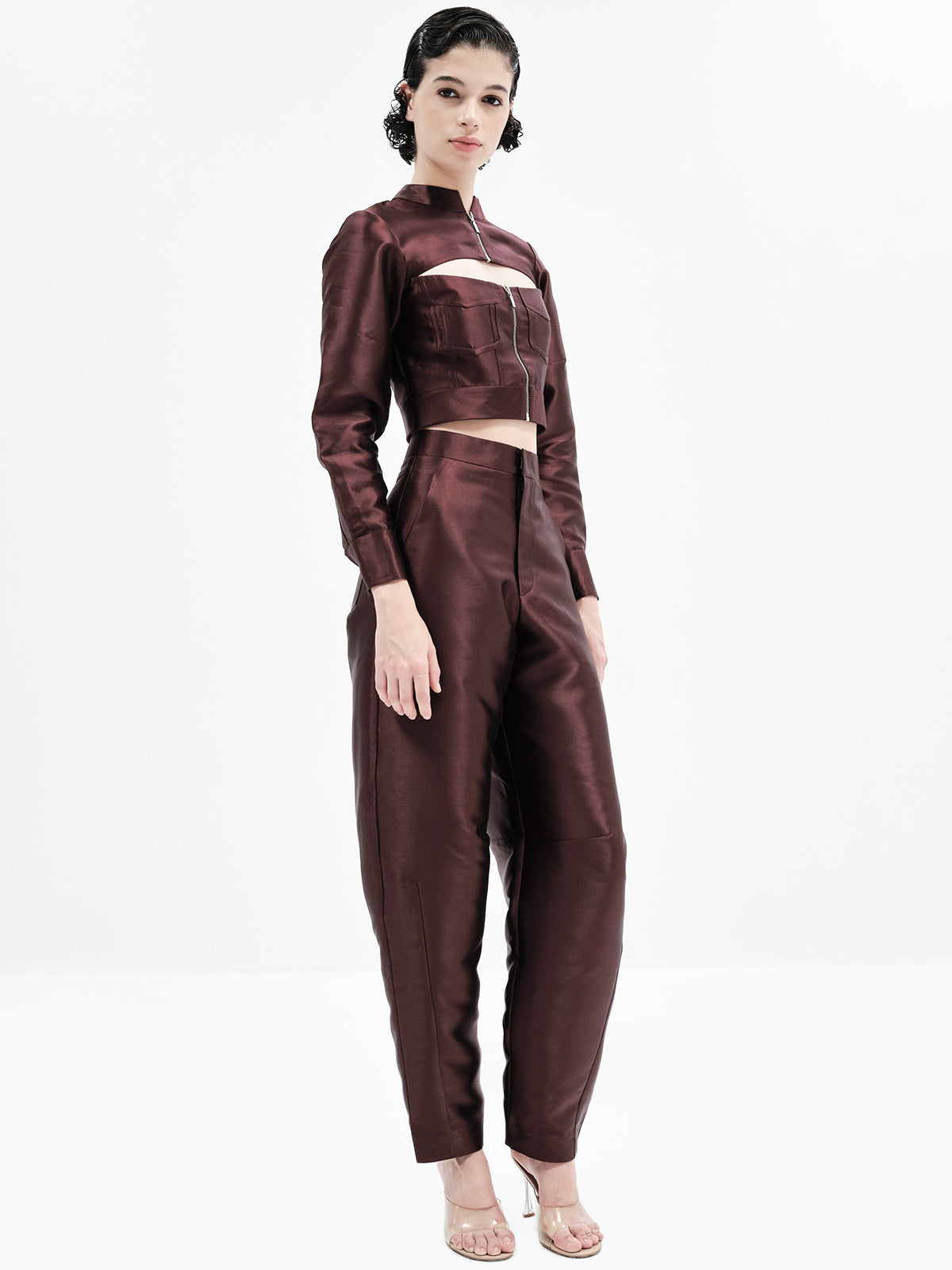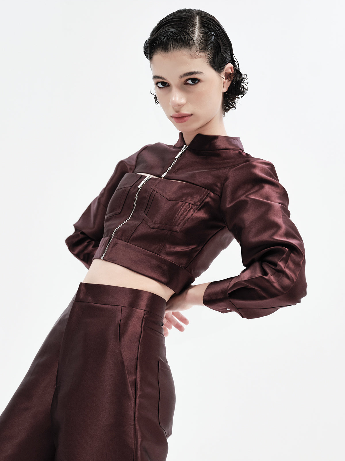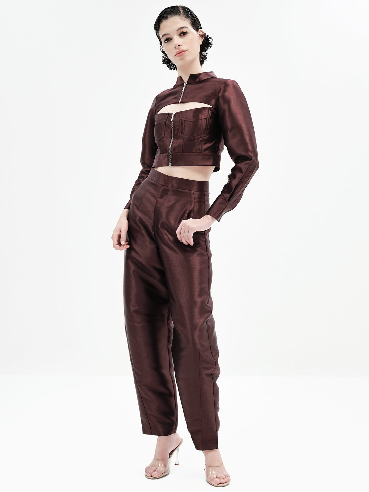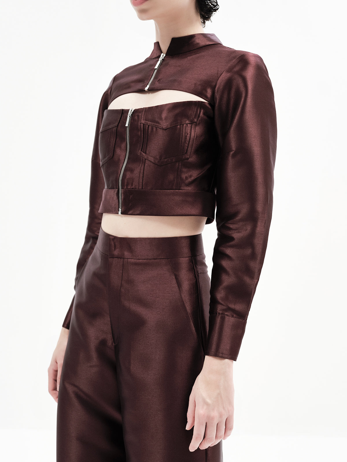 This edgy bomber-inspired crop features a peekaboo neckline, metal zipper accents, and precise seam detailing for a statement finish. Pair it effortlessly with any of our high-waisted bottoms to create multiple elevated looks—our top picks are the Maria Pants, Laticia Shorts or Eddie Pants for a chic co-ord ensemble.